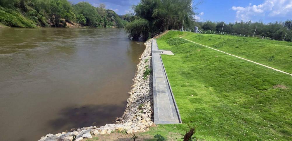 มีเขื่อนหน้าแม่น้ำ เป็นลานกิจกรรม ชิดแม่น้ำมาตรฐานสูงกันน้ำ กว้าง 70 เมตร ถมหินเขื่อนเรียงเรียบร้อย